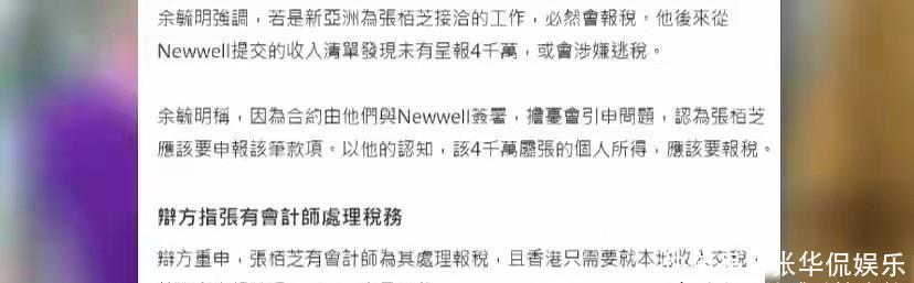 核心争议二:税务问题起分歧,政策差异成焦点庭审中,余毓兴方进一步提出,张柏芝收取4000万港元片酬后未依法报税,存在税务合规争议。对此,张柏芝方迅速回应,称依据香港与大陆的税收政策差异,其在大陆拍戏的相关收入已在大陆完成报税,按照“一地一税”原则,无需在香港重复申报。双方就税收申报的适用范围、政策依据展开辩论,均提交了相关政策条文作为佐证,但未能达成共识,该争议仍需法院结合两地税收法规进一步核查。